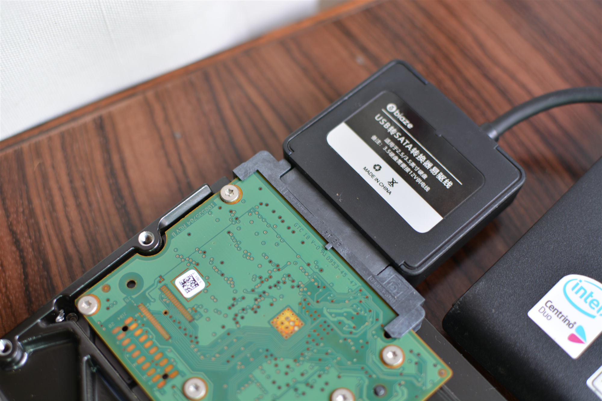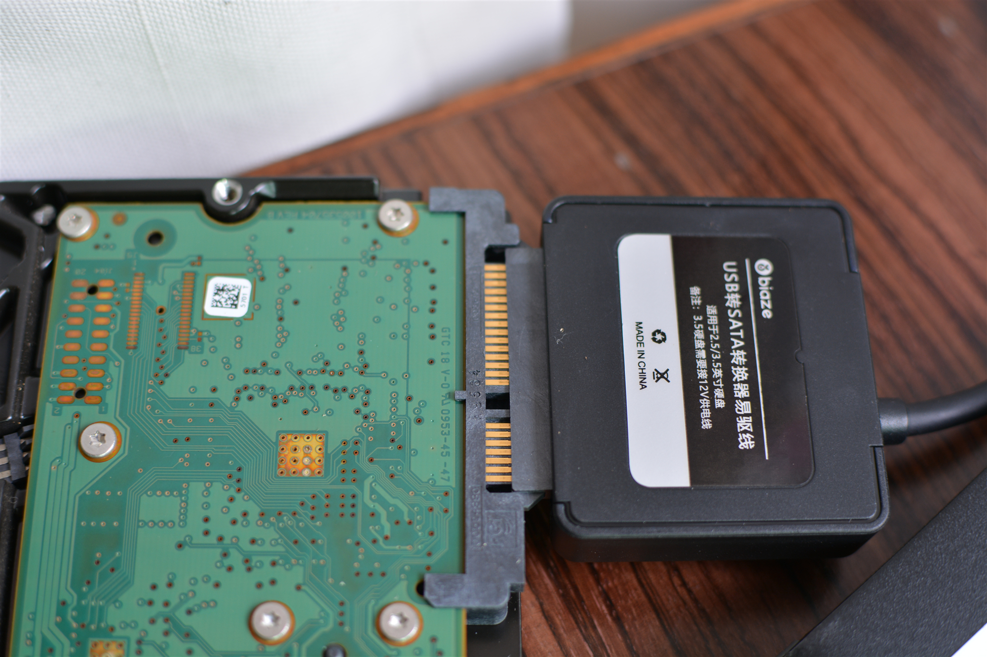 用毕亚兹USB转SATA转换器接硬盘的时候方向要弄清,稍许用力就能扣紧,可不要用蛮力。这个数据转换器仅支持SATA接口,IDE接口肯定是不支持的。